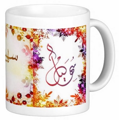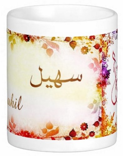 Mug avec le prénom "Souhil" écrit en français, en arabe (سهيل) et calligraphié de façon artistique en arabe sur la partie droite.