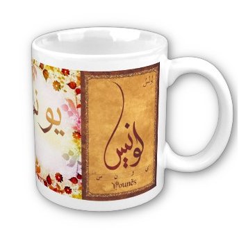 Mug avec le prénom "Younès" calligraphié en arabe (يونس) ainsi que son épellation lettre par lettre en arabe.