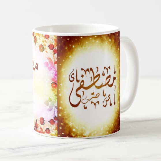 Mug avec le prénom mustafa calligraphié en arabe ainsi que son écriture normale en arabe (مصطفى) et en français.