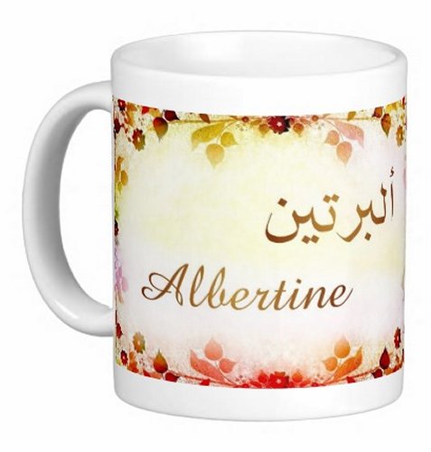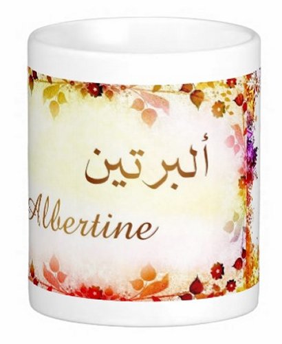 Mug avec le prénom "Albertine" écrit en français, en arabe (ألبرتين) et calligraphié de façon artistique en arabe sur la partie droite.