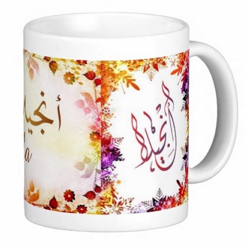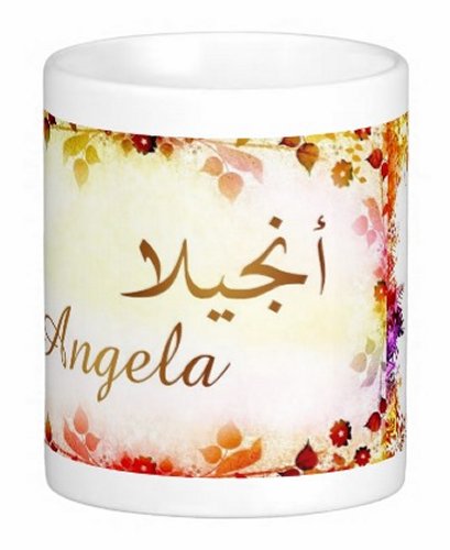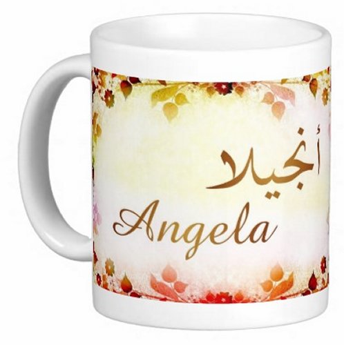 Mug avec le prénom "Angela" écrit en français, en arabe (أنجيلا) et calligraphié de façon artistique en arabe sur la partie droite.