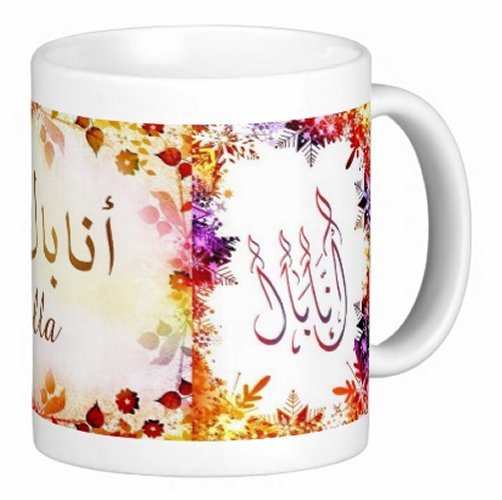 Mug avec le prénom "Annabella" écrit en français, en arabe (أنابال) et calligraphié de façon artistique en arabe sur la partie droite.