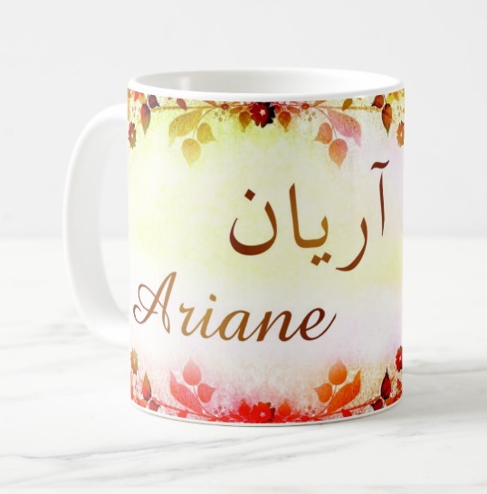 Mug avec le prénom Ariane calligraphié en arabe ainsi que son écriture normale en arabe (آريان) et en français.
