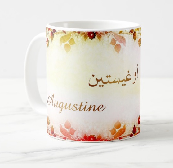 Mug avec le prénom "Augustine" écrit en français, en arabe (أوغيستين) et calligraphié de façon artistique en arabe sur la partie droite.