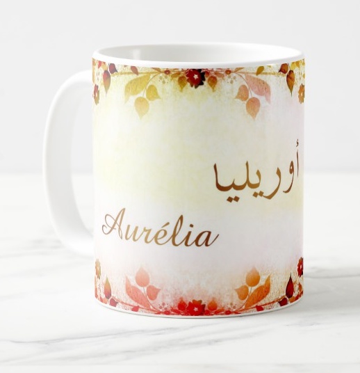 Mug avec le prénom "Aurélia" écrit en français, en arabe (أوريليا) et calligraphié de façon artistique en arabe sur la partie droite.