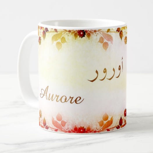 Mug avec le prénom "Aurore" écrit en français, en arabe (أورور) et calligraphié de façon artistique en arabe sur la partie droite.