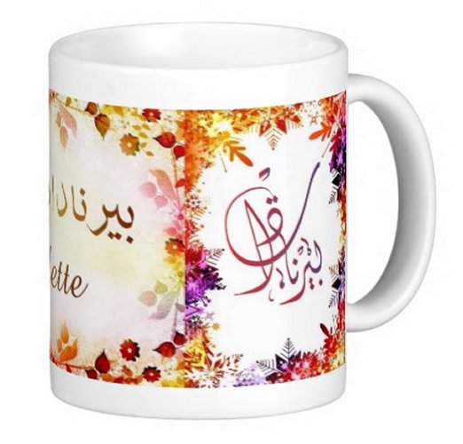 Mug avec le prénom "Bernadette" écrit en français, en arabe (بيرنادات) et calligraphié de façon artistique en arabe sur la partie droite.