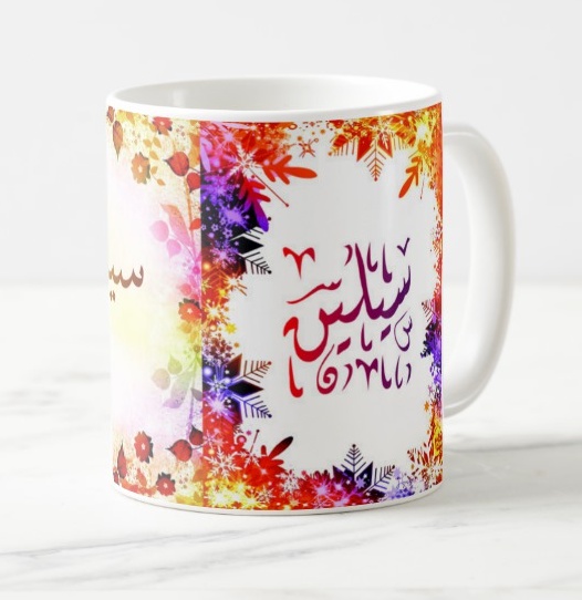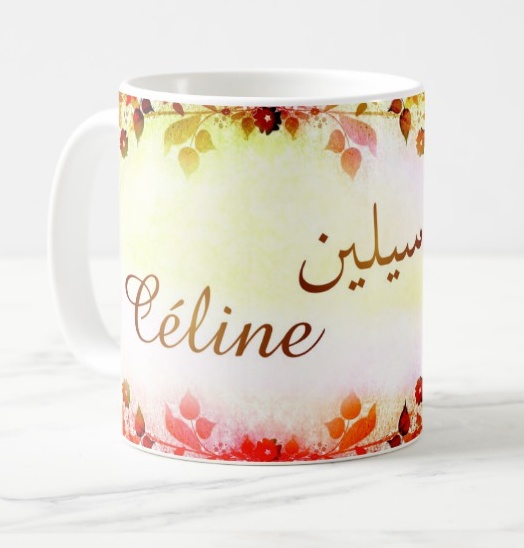Mug avec le prénom Céline calligraphié en arabe ainsi que son écriture normale en arabe (سيلين) et en français.