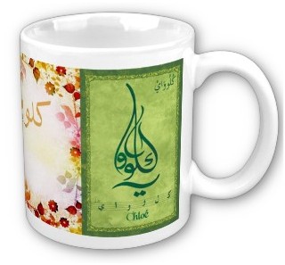 Mug avec le prénom "Chloé" calligraphié en arabe (كلوواي) ainsi que son épellation lettre par lettre en arabe.