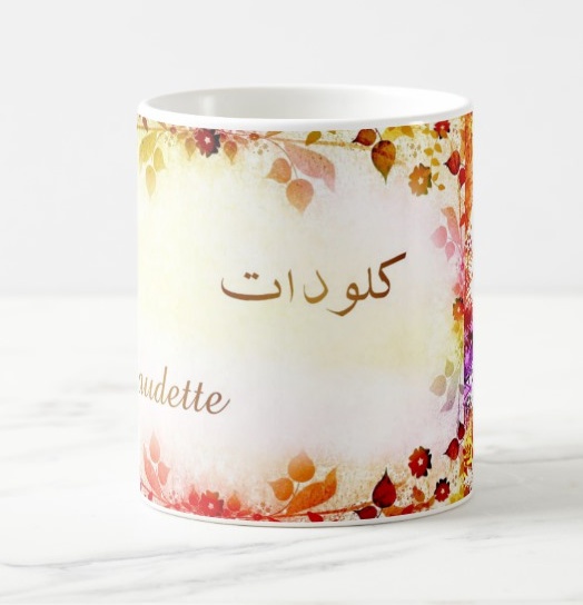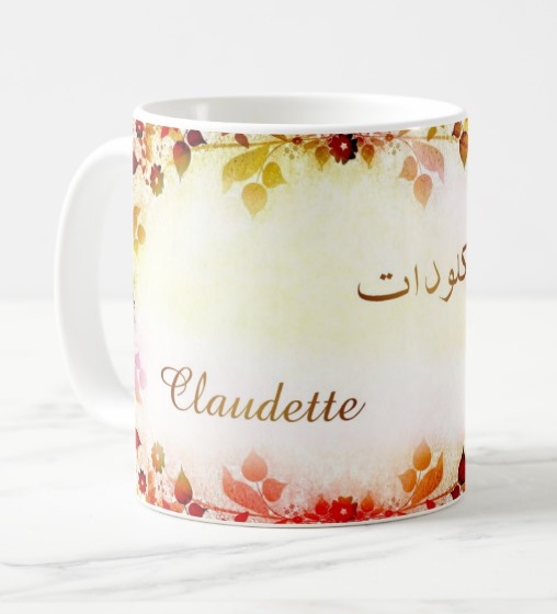 Mug avec le prénom Claudette calligraphié en arabe ainsi que son écriture normale en arabe (كلودات) et en français.