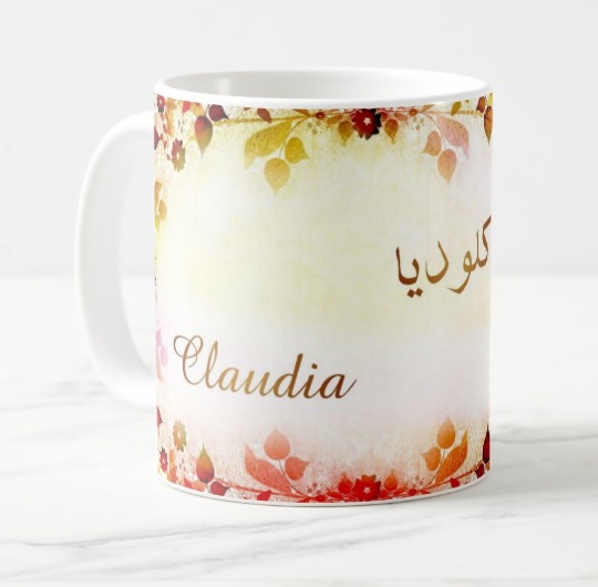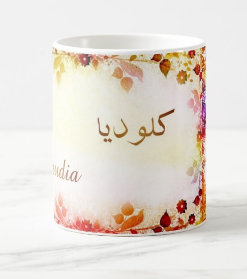 Mug avec le prénom Claudia calligraphié en arabe ainsi que son écriture normale en arabe (كلوديا) et en français.