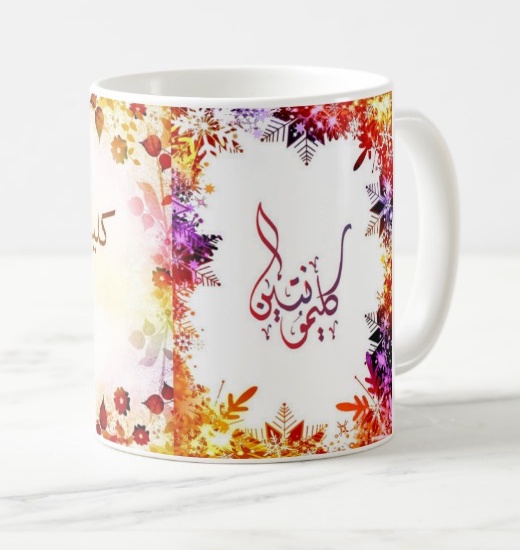 Mug avec le prénom Clémentine calligraphié en arabe ainsi que son écriture normale en arabe (كليمونتين) et en français.