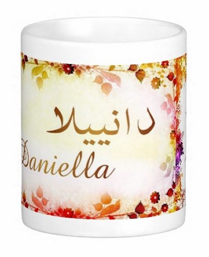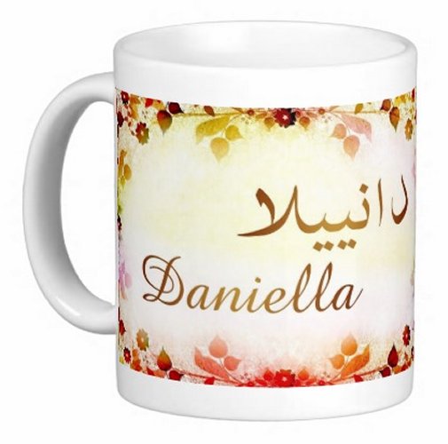 Mug avec le prénom "Daniella" écrit en français, en arabe (دانييلا) et calligraphié de façon artistique en arabe sur la partie droite.