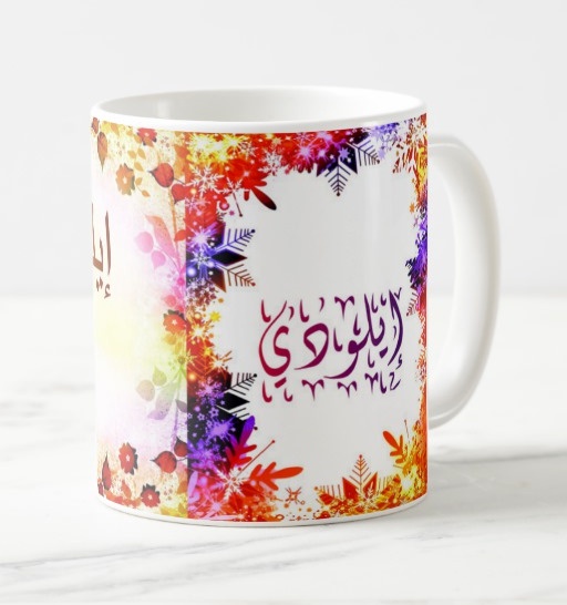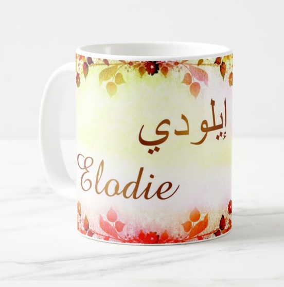 Mug avec le prénom Elodie calligraphié en arabe ainsi que son écriture normale en arabe (إيلودي) et en français.