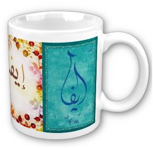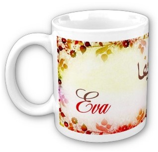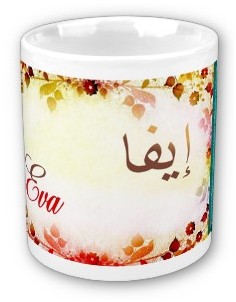 Mug avec le prénom "Eva" calligraphié en arabe (ايفا) ainsi que son épellation lettre par lettre en arabe.