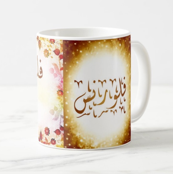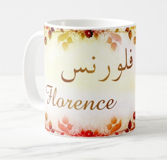 Mug avec le prénom "Florence" écrit en français, en arabe (فلورنس) et calligraphié de façon artistique en arabe sur la partie droite.