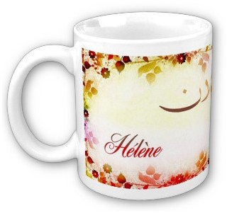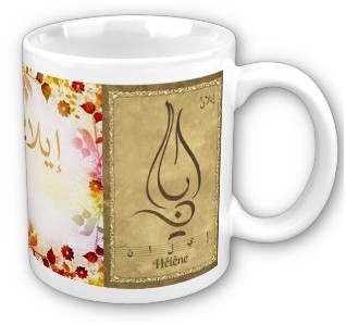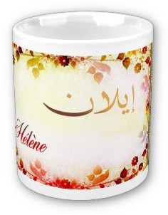 Mug avec le prénom "Hélène" calligraphié en arabe (ايلان) ainsi que son épellation lettre par lettre en arabe.