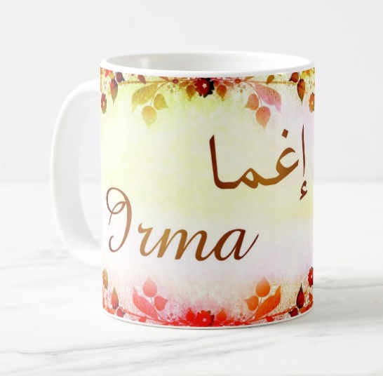 Mug avec le prénom Irma calligraphié en arabe ainsi que son écriture normale en arabe (إغما) et en français.