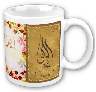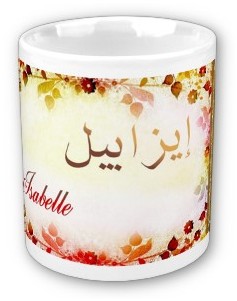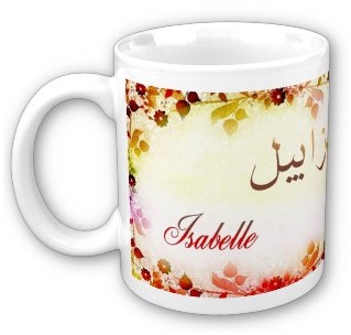 Mug avec le prénom "Isabelle" calligraphié en arabe (ايزابيل) ainsi que son épellation lettre par lettre en arabe.