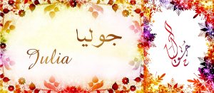 Mug avec le prénom "Julia" écrit en français, en arabe (جوليا) et calligraphié de façon artistique en arabe sur la partie droite.