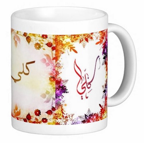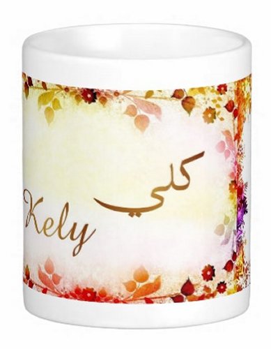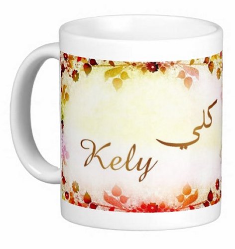 Mug avec le prénom "Kely" écrit en français, en arabe (كلي) et calligraphié de façon artistique en arabe sur la partie droite.