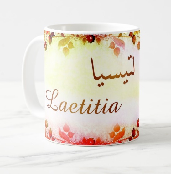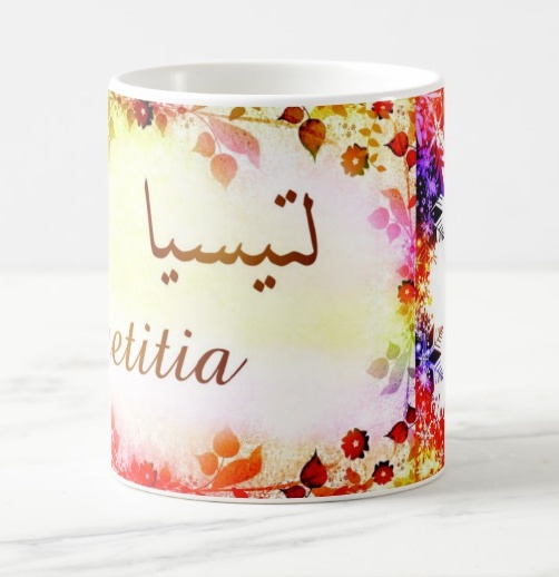 Mug avec le prénom Maetitia calligraphié en arabe ainsi que son écriture normale en arabe (لتيسيا) et en français.