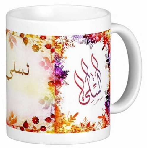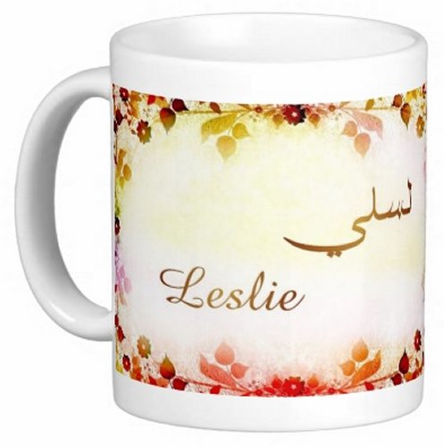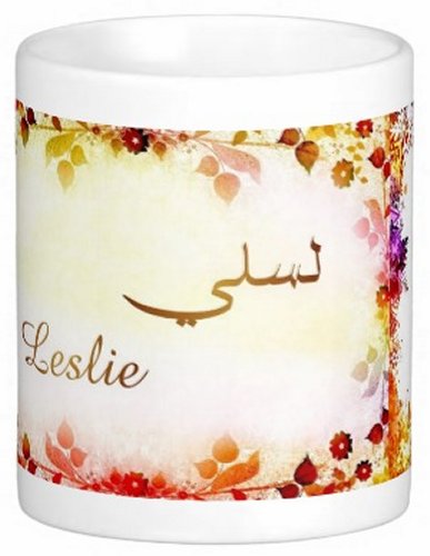 Mug avec le prénom "Leslie" écrit en français, en arabe (لسلي) et calligraphié de façon artistique en arabe sur la partie droite.