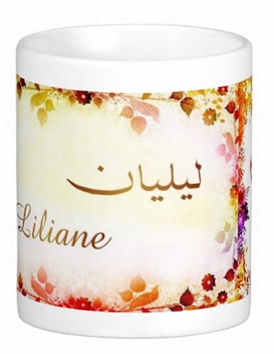 Mug avec le prénom "Liliane" écrit en français, en arabe (ليليان) et calligraphié de façon artistique en arabe sur la partie droite.