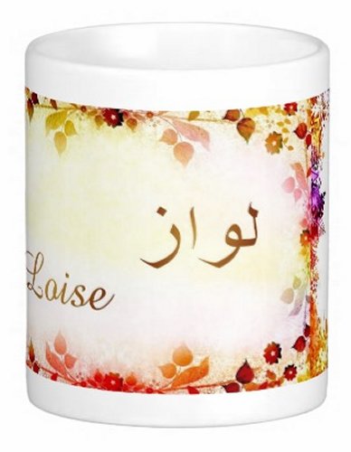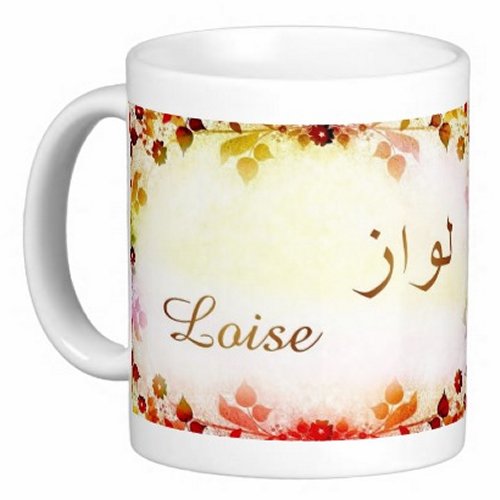 Mug avec le prénom "Loïse" écrit en français, en arabe (لوز) et calligraphié de façon artistique en arabe sur la partie droite.