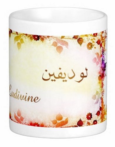 Mug avec le prénom "Ludivine" écrit en français, en arabe (لوديفين) et calligraphié de façon artistique en arabe sur la partie droite.
