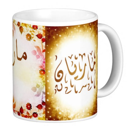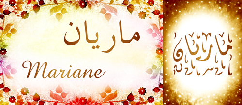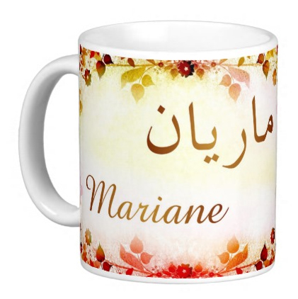 Mug avec le prénom "Mariane" écrit en français, en arabe (ماريان) et calligraphié de façon artistique en arabe sur la partie droite.