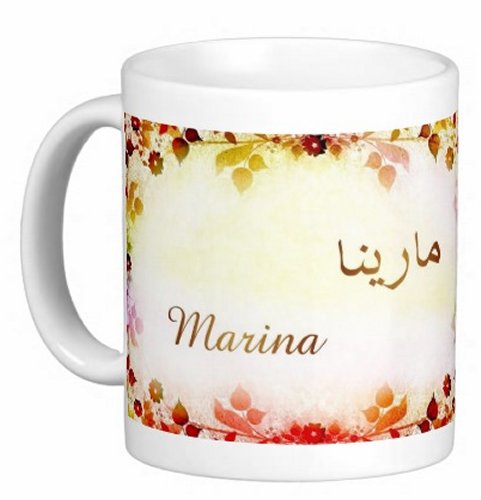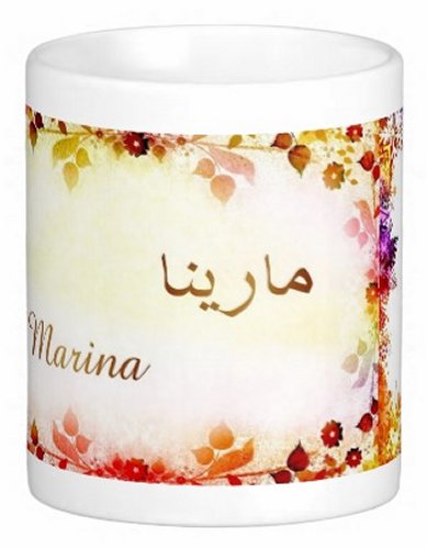 Mug avec le prénom "Marina" écrit en français, en arabe (مارينا) et calligraphié de façon artistique en arabe sur la partie droite.