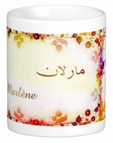 Mug avec le prénom "Marlène" écrit en français, en arabe (مارلان) et calligraphié de façon artistique en arabe sur la partie droite.