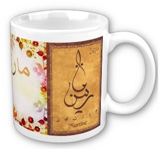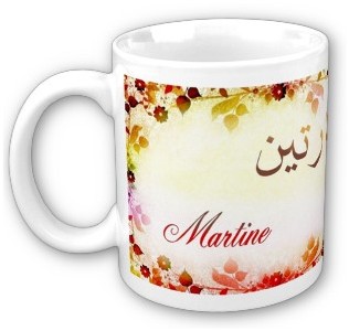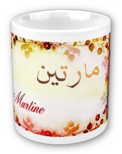 Mug avec le prénom "Martine" calligraphié en arabe (مارتين) ainsi que son épellation lettre par lettre en arabe.
