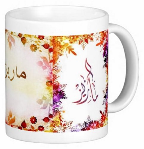 Mug avec le prénom "Maryse" écrit en français, en arabe (ماريز) et calligraphié de façon artistique en arabe sur la partie droite.
