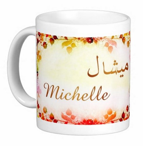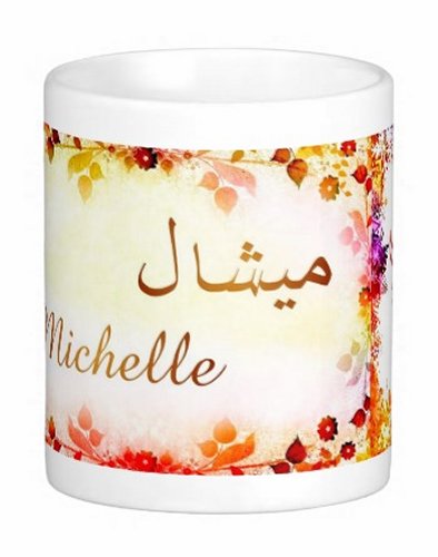 Mug avec le prénom "Michelle" écrit en français, en arabe (ميشال) et calligraphié de façon artistique en arabe sur la partie droite.