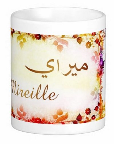 Mug avec le prénom "Mireille" écrit en français, en arabe (ميراي) et calligraphié de façon artistique en arabe sur la partie droite.