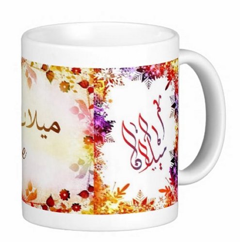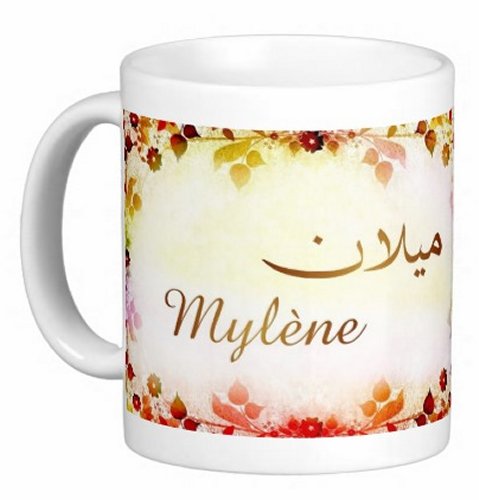 Mug avec le prénom "Mylène" écrit en français, en arabe (ميلان) et calligraphié de façon artistique en arabe sur la partie droite.
