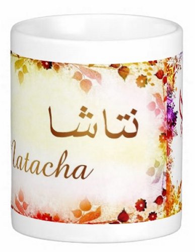 Mug avec le prénom "Natacha" écrit en français, en arabe (نتاشا) et calligraphié de façon artistique en arabe sur la partie droite.