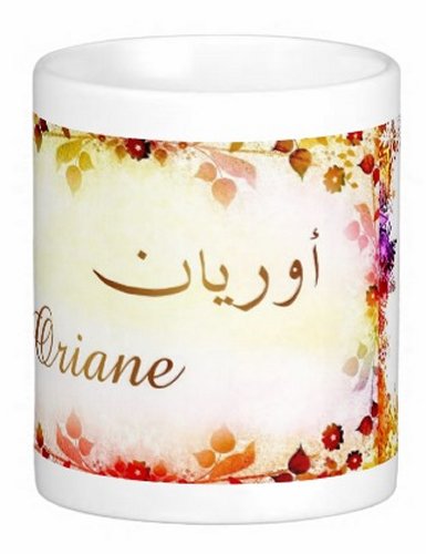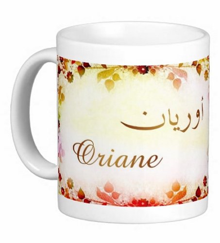Mug avec le prénom "Oriane" écrit en français, en arabe (أوريان) et calligraphié de façon artistique en arabe sur la partie droite.
