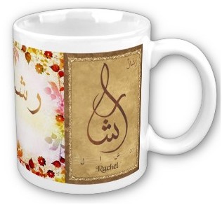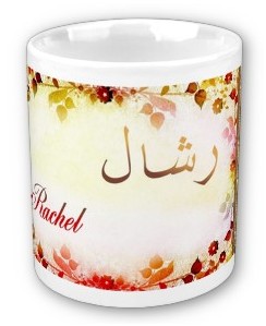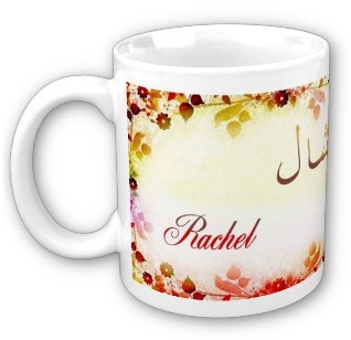 Mug avec le prénom "Rachel" calligraphié en arabe (رشال) ainsi que son épellation lettre par lettre en arabe.