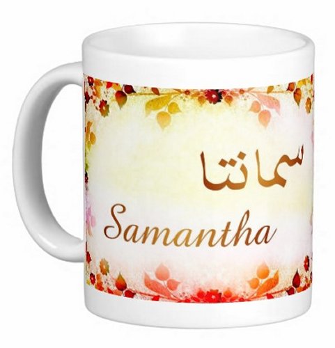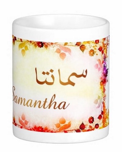 Mug avec le prénom "Samantha" écrit en français, en arabe (سمانتا) et calligraphié de façon artistique en arabe sur la partie droite.