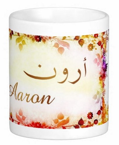 Mug avec le prénom "Aaron" écrit en français, en arabe (أرون) et calligraphié de façon artistique en arabe sur la partie droite.