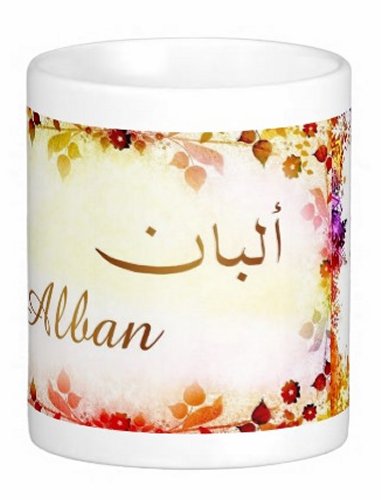 Mug avec le prénom "Alban" écrit en français, en arabe (ألبان) et calligraphié de façon artistique en arabe sur la partie droite.
