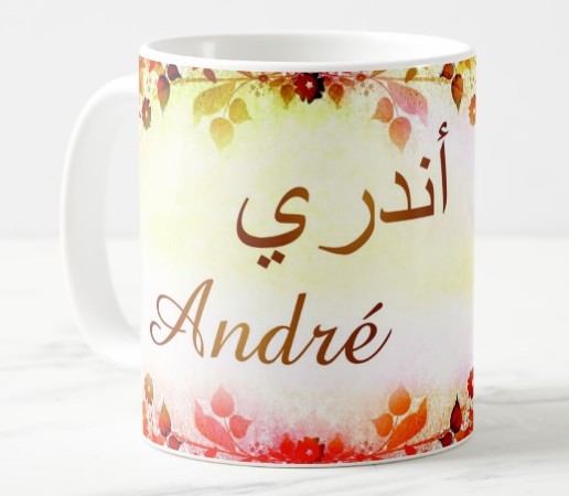 Mug avec le prénom "André" écrit en français, en arabe (أندري) et calligraphié de façon artistique en arabe sur la partie droite.