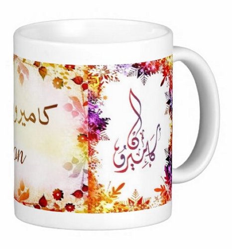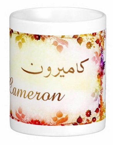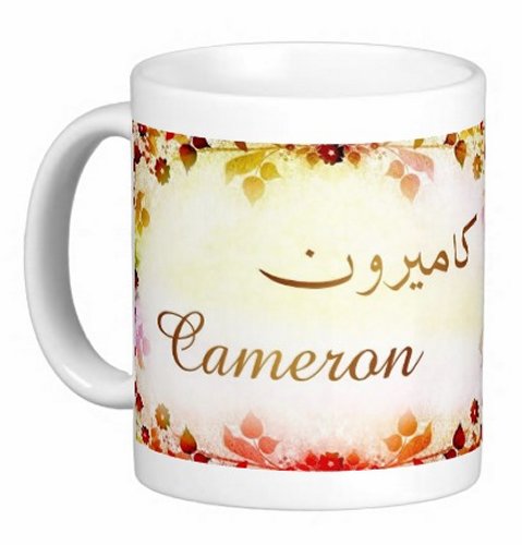 Mug avec le prénom "Cameron" écrit en français, en arabe (كاميرون) et calligraphié de façon artistique en arabe sur la partie droite.
