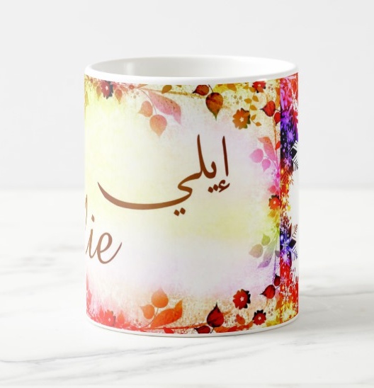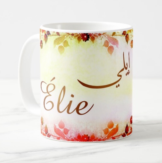 Mug avec le prénom Élie calligraphié en arabe ainsi que son écriture normale en arabe (إيلي) et en français.