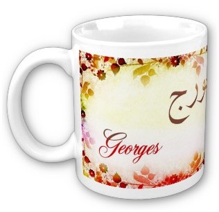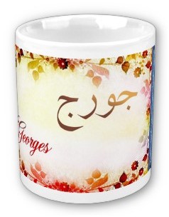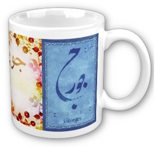 Mug avec le prénom "Georges" calligraphié en arabe (جورج) ainsi que son épellation lettre par lettre en arabe.