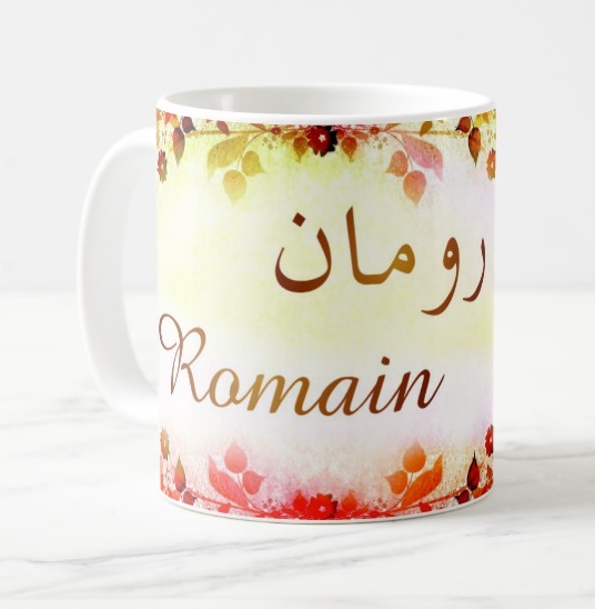 Mug avec le prénom "Romain" écrit en français, en arabe (رومان) et calligraphié de façon artistique en arabe sur la partie droite.