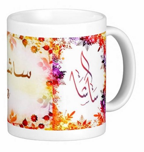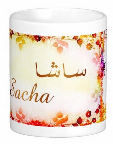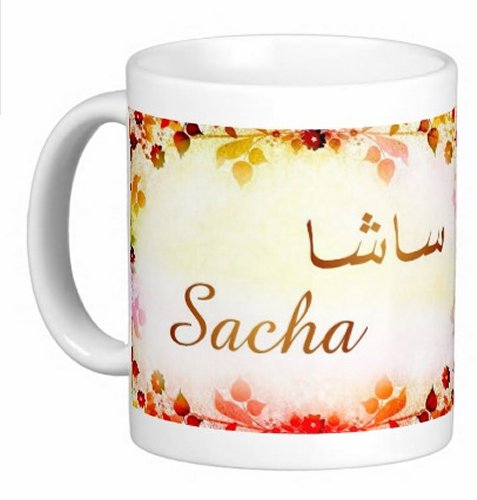Mug avec le prénom "Sacha" écrit en français, en arabe (ساشا) et calligraphié de façon artistique en arabe sur la partie droite.